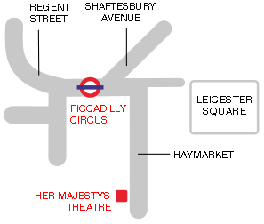 Her Majesty's Theatre is on Haymarket, about 8 minutes walk from Piccadilly Circus.